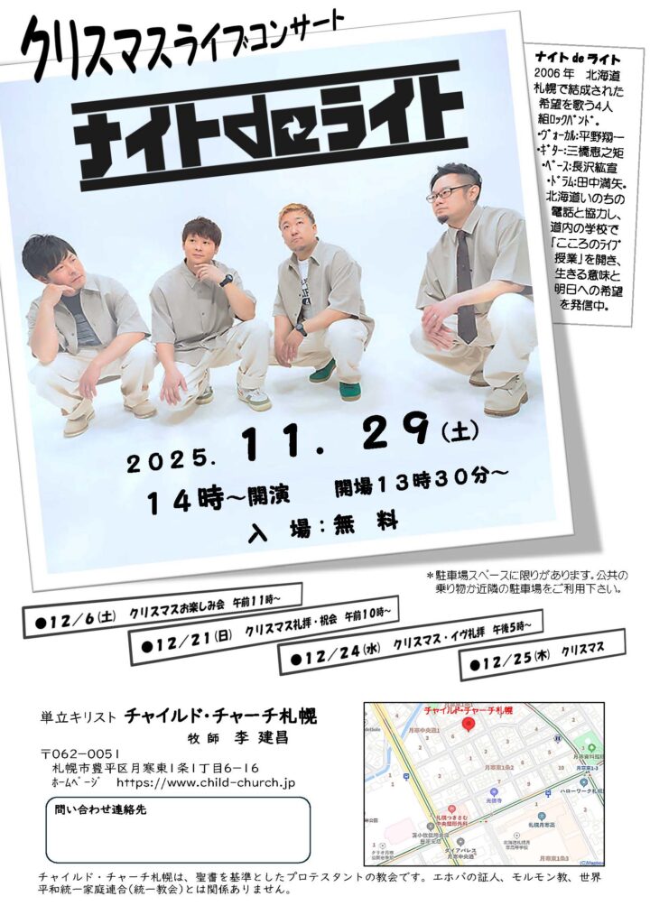 希望を歌う「ナイトdeライト」さんをお招きしクリスマスライブコンサートをします。ご家族やご友人をお誘い合わせの上、お気軽にお越しください。 クリスマスライブコンサート ナイトdeライト 2025. 11 . 29 土曜日 14時~ 13時30分~開場 入場無料 単立 キリストチャイルド・チャーチ札幌札幌市豊平区月寒東1条1丁目6−16 駐車場に限りがありますので、公共の乗り物か近隣の駐車場をご利用ください。 画像クリックでPDFがダウンロードできます