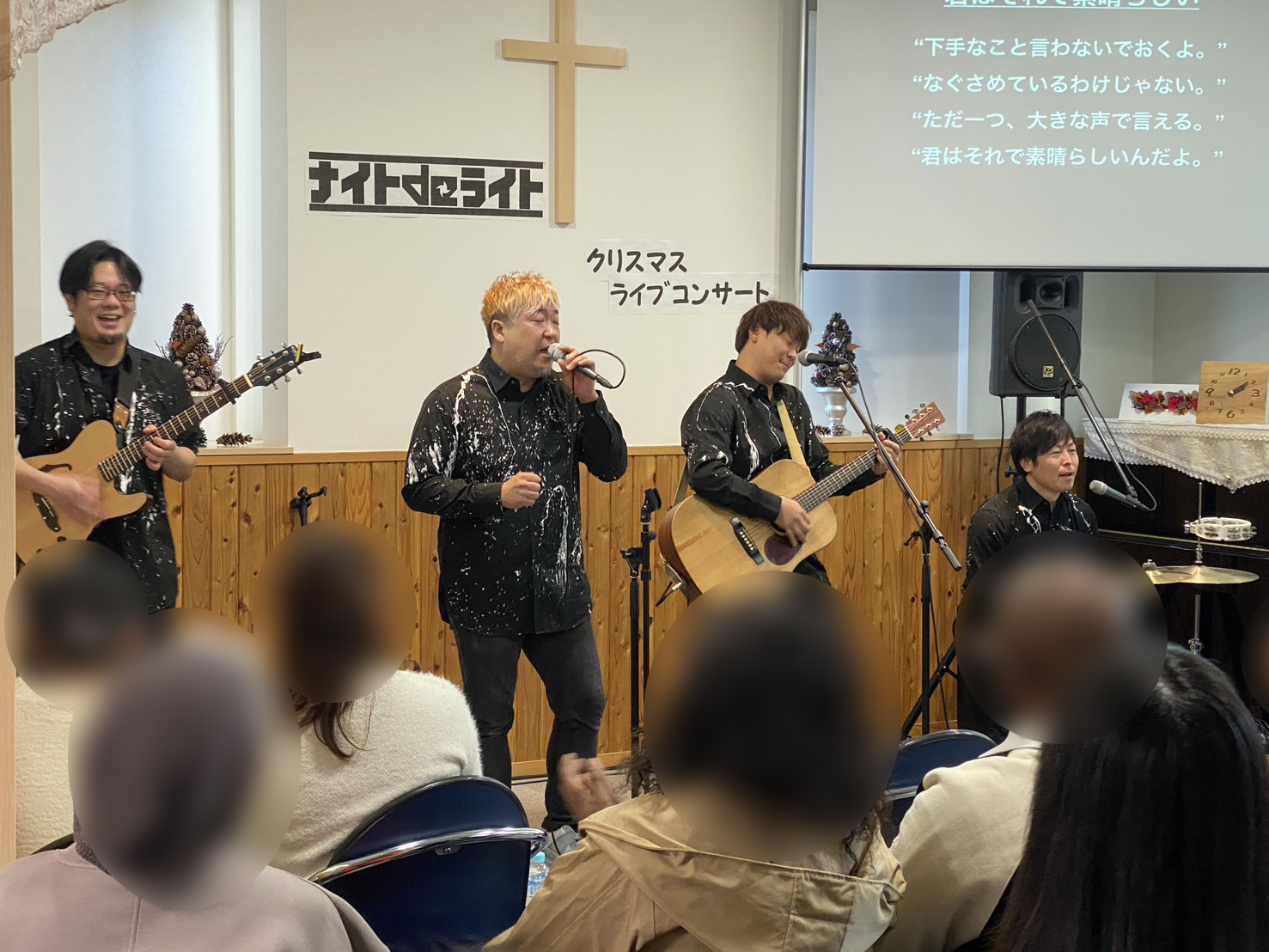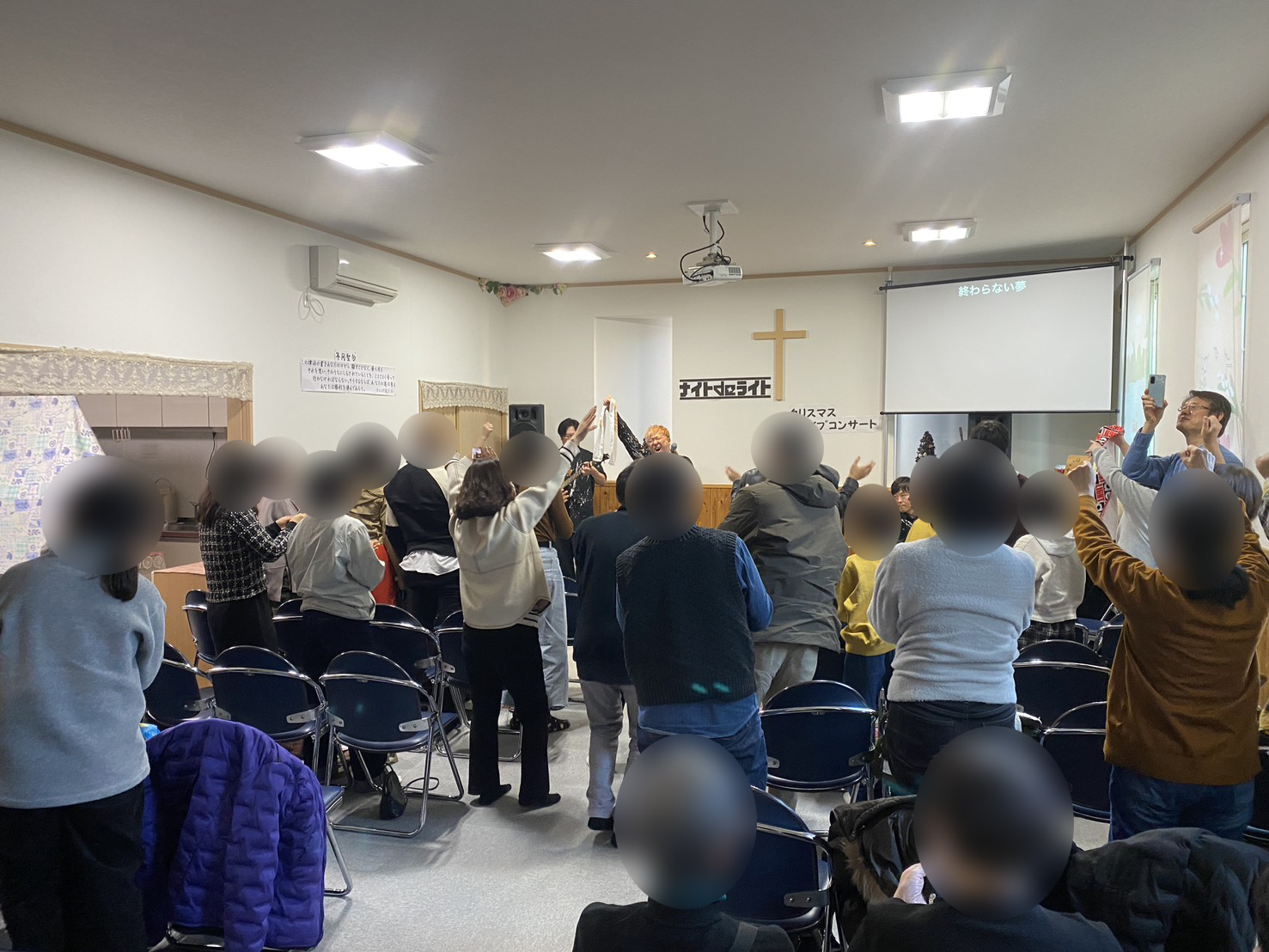 聞き慣れたクリスマスの曲も歌われ、また会場の皆んなで声を合わせて、拳を上げて歌い、ひとつになり盛り上がりました。アンコールにも応えて歌って下さり、終わるのが名残惜しかったです。その後、メンバーさんと記念写真を撮る光景があちらこちらで…。