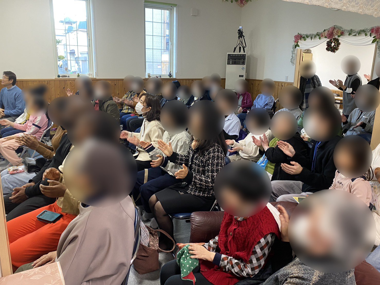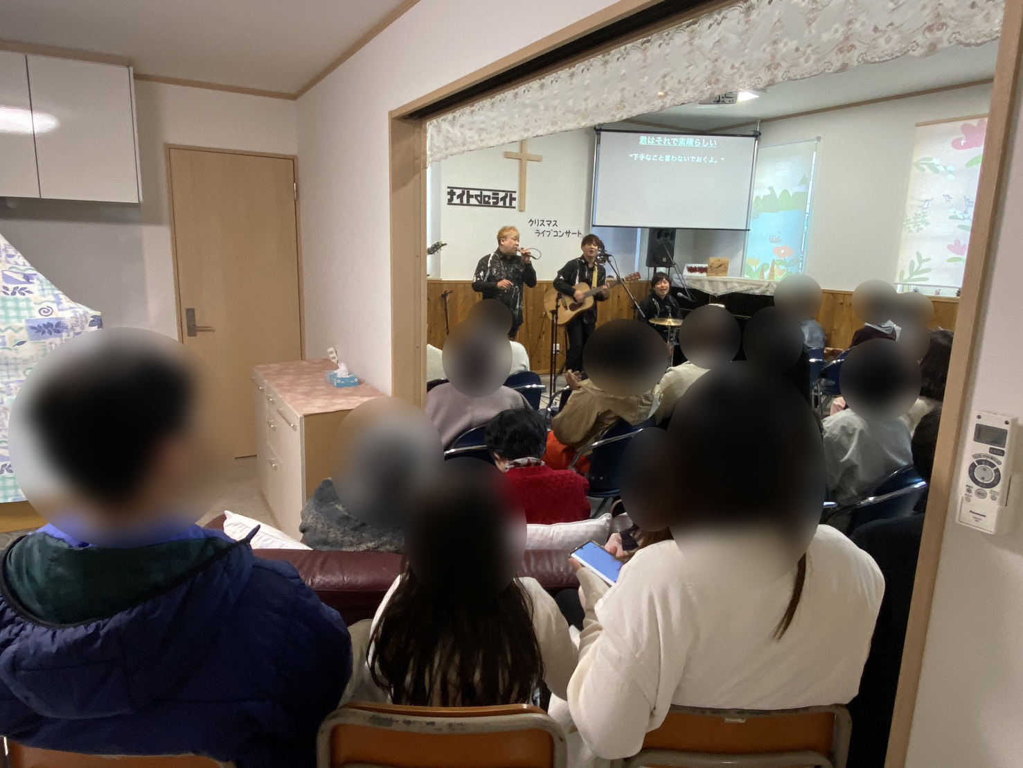 来場者が次から次へと…、用意したイス席がいっぱいになりました。そして一曲目から心に染みる詩の歌を聴かせて下さいました。またトークの時間には、クリスマスの意味をまだ信じていない方々に向けて「私たちは、イエス・キリストを神様からプレゼントされていること」を分かりやすくメッセージして下さいました。