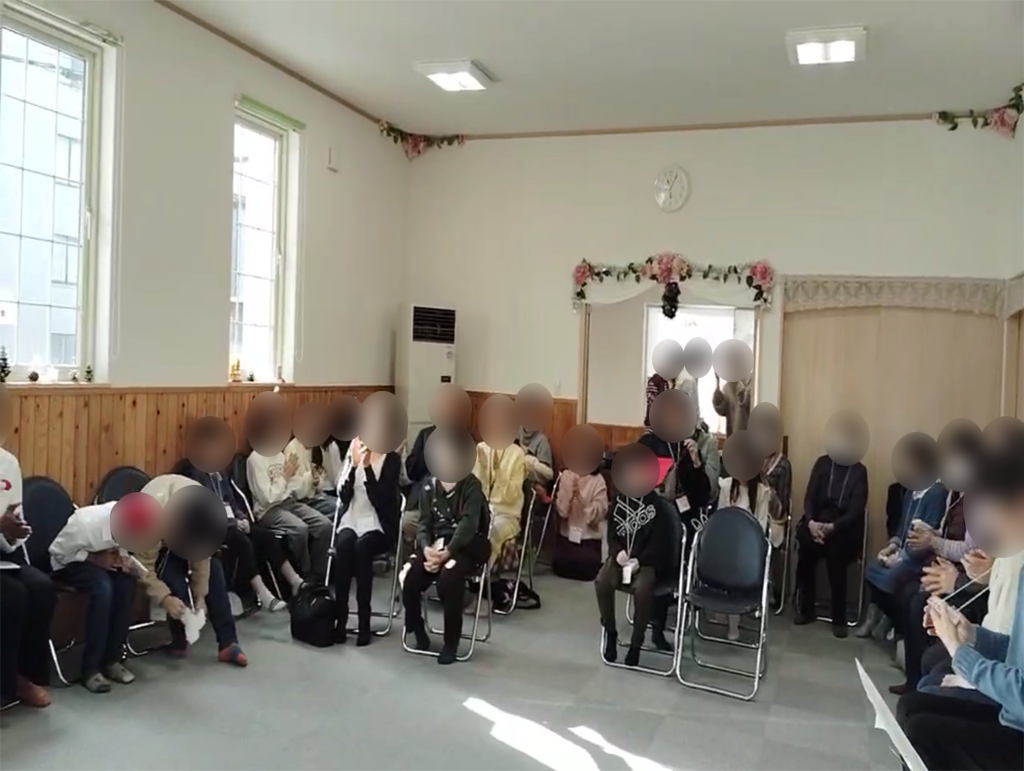 次は、参加者全員でのゲームが始まりました。イスを取らないイス取りゲームです。嬉しいことに神様は、たくさんの参加者を招いて下さり、会場が狭いほどになりました。その中で、チキンダンスを踊りながら曲が止まった所のイス当たります。楽しく参加出来ました。最後に残ったお友だちと、上手に踊った方に景品が当たりました。